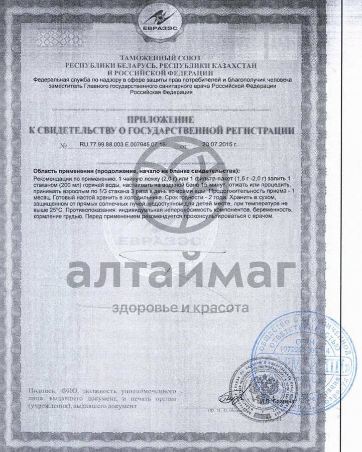 1 чайную ложку (2,0 г) продукта залить 1 стаканом (200 мл) горячей воды, настоять на водяной бане 15 минут, процедить, принимать взрослым по 1/3 стакана 3 раза в день во время еды. Готовый настой хранить в холодильнике.