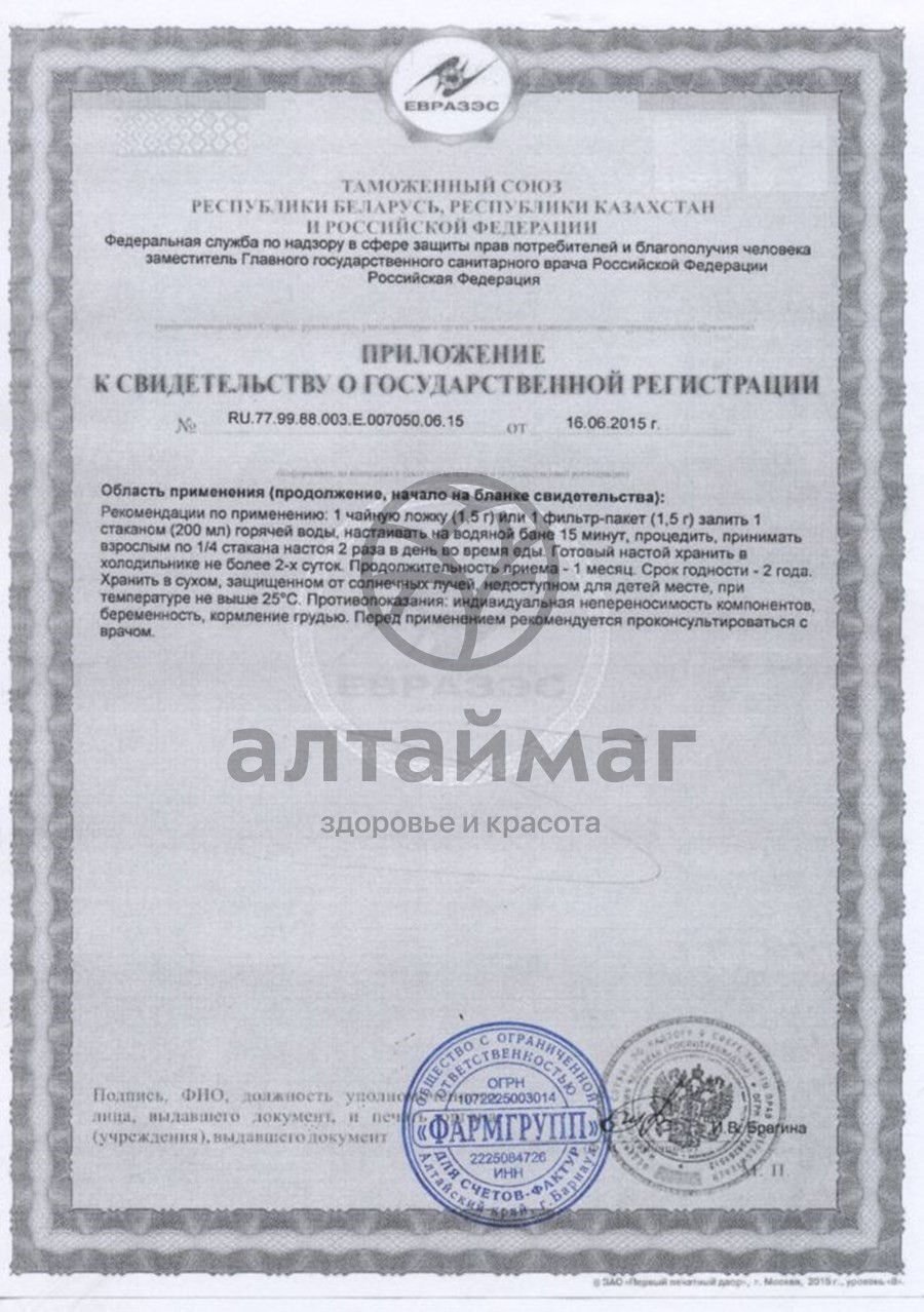 1 фильтр-пакет (1,5 г) залить одним стаканом (200 мл) горячей воды, настоять на водяной бане 15 минут, процедить, принимать взрослым по ¼ стакана 2 раза в день во время еды. Готовый настой хранить в холодильнике не более 2-х суток. Продолжительность приема – 1 месяц.