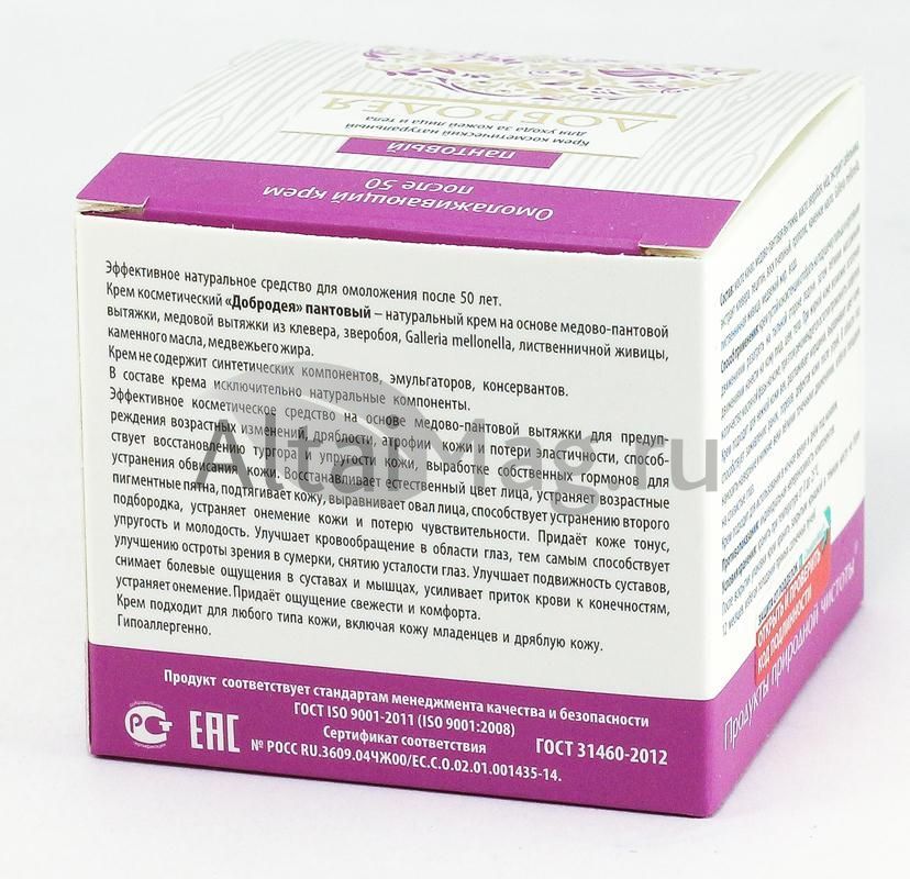 Крем «Пантовый» серии «Добродея» - эффективное косметическое средство на основе медово-пантовой вытяжки для предупреждения возрастных изменений кожи, дряблости, способствует восстановлению тургора и упругости кожи, обладает эффектом лифтинга, способствует улучшению подвижности суставов, снимает болевые ощущения в суставах и мышцах, усиливает приток крови к конечностям, устраняет онемение