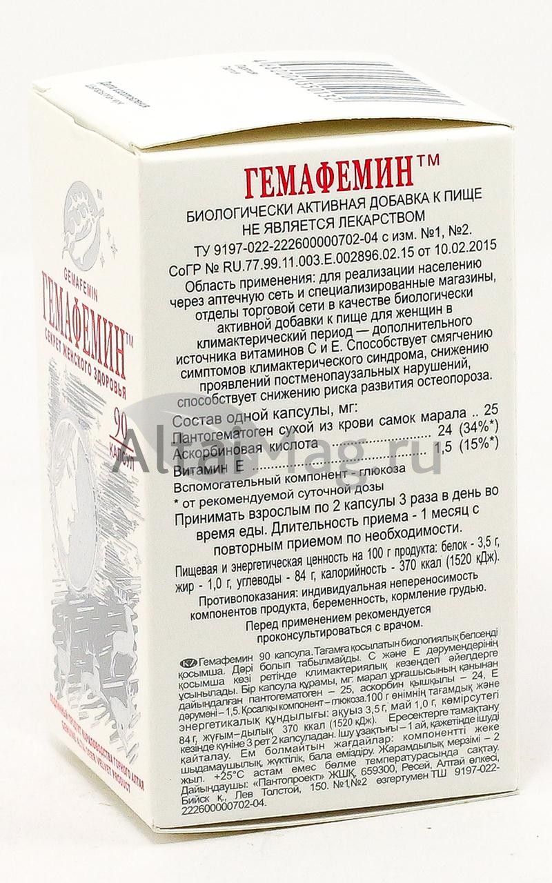 - Купите Гемафемин, 90 капс. в Армавире по доступной цене 911 ₽ с доставкой на дом или заберите Ваш заказ в Армавире из ближайшего пункта выдачи, сделав заказ на AltaiMag.ru.