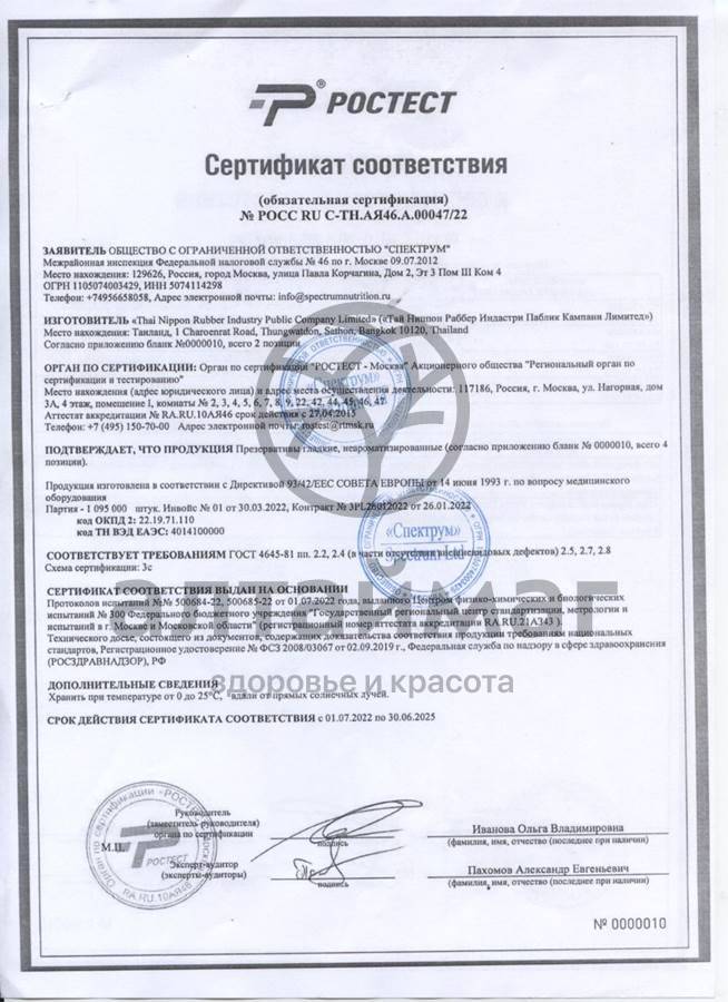 Не пользуйтесь острыми предметами при открытии индивидуальных упаковок. Открывать их необходимо только пальцами, стараясь не задеть поверхность кондома ногтями. Не открывайте презерватив преждевременно – смазка может высохнуть до надевания. Используйте только смазки на водной или силиконовой основе, так как масляные лубриканты разрушают структуру латекса. Дождитесь устойчивой эрекции, чтобы надеть презерватив, в противном случае это вызовет затруднения. Зажимайте накопитель пальцами перед надеванием, чтобы выпустить воздух и освободить место для спермы.Характеристики: