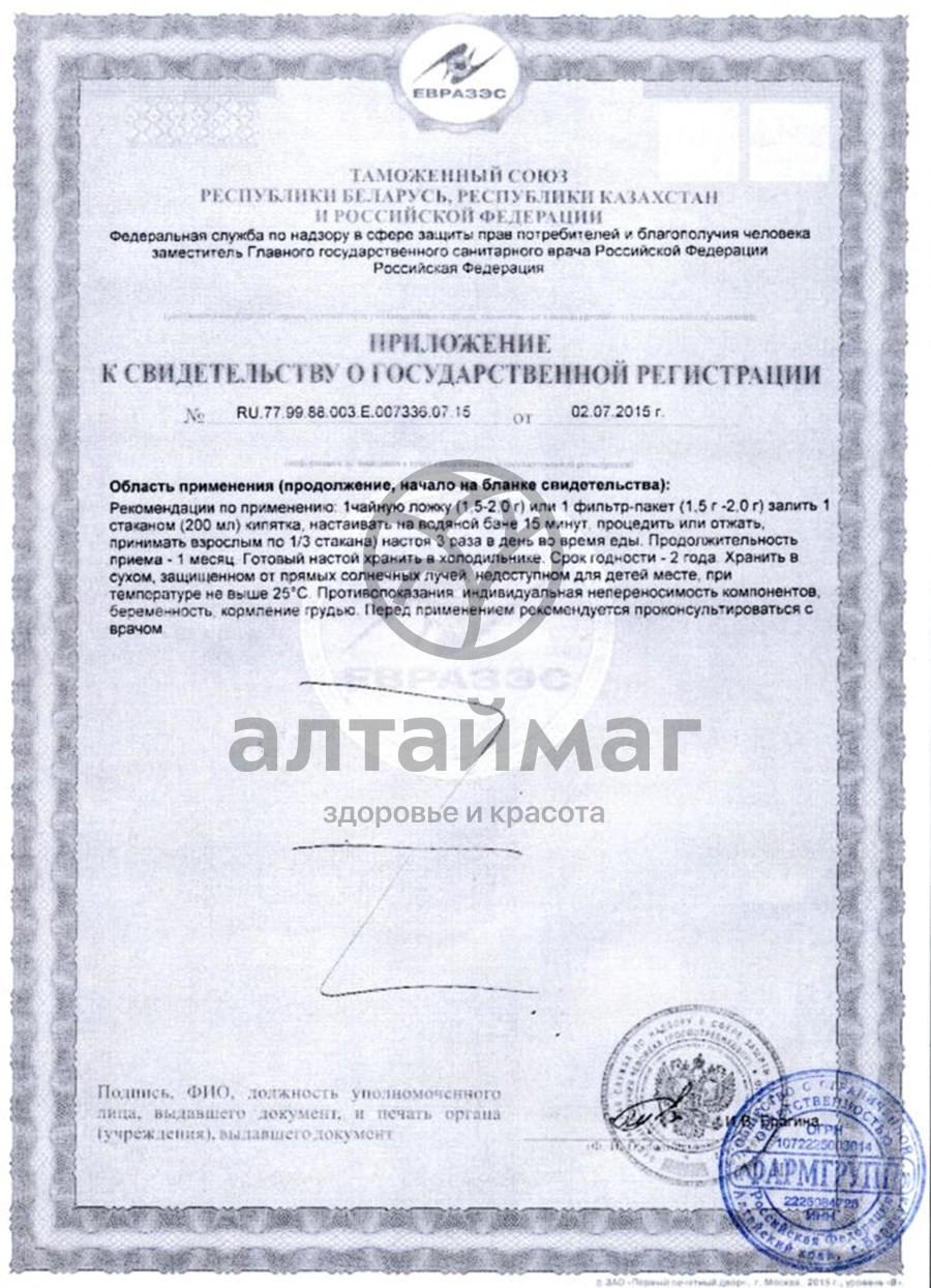 1 чайную ложку (1,5-2,0 г) залить 1 стаканом (200 мл) горячей воды, настоять на водяной бане 15-20 минут, процедить, принимать взрослым по 1/3 стакана 3 раза в день во время еды. Готовый настой хранить в холодильнике.