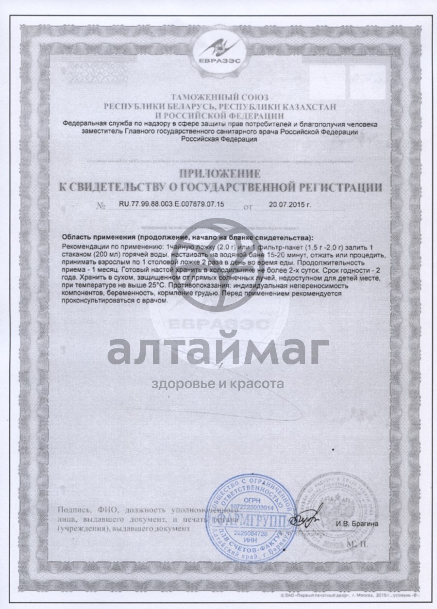 1 чайную ложку (2,0 г) залить 1 стаканом (200 мл) кипятка, настоять 15 минут на водяной бане, отжать или процедить, принимать по 1 столовой ложке 2 раза в день во время еды. Готовый настой хранить в холодильнике не более 2-х суток.